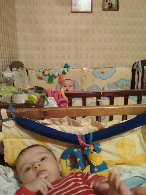 Умелки?.. Ну вот когда я тут ныла, что дети не переворачиваются, а я так хочухочухочу... В общем, верните меня в прошлое и стукните чем-нибудь тяжёлым😂 Они это делают почти месяц. Перед детским сном теперь играем в "мамочку-лопаточку" и "папочку-лопаточку". Ибо они устают и орут, чтобы их перевернули обратно. И мы спешим на помощь, отскребая их животики от кровати, для того, чтобы через секунду услышать кряхтение, а через минуту ор, свидетельствующий о том, что снова нужна лопаточка. И так минимум по 6 раз, пока не выдохнутся. Хотят спать на животе, но голову положить пока додуматься не могут. Теперь и во сне могут развернуться. Вчера Кира, проспав 15 минут, кувыркнулась и лежала, задрав голову, с закрытыми глазами. На спине вообще лежать не хочет. Вот это - самое частое зрелище с нашего места: