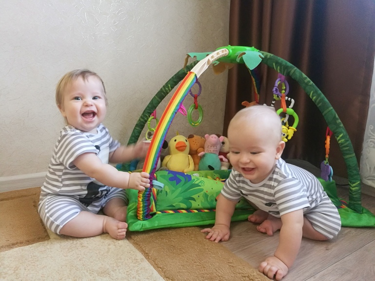 Двойняшки до 1 годаКак же быстро летит время. Вчера нашим мальчикам исполнилось 7. Следить за ними стало гораздо сложнее, отойти почти невозможно🙈 Рост не знаем, вес -Андрей 8190, Владимир 8540. Развиваемся одинаково +- неделя. За этот месяц много всего было🙂 ровно в 6 поползли по-пластунски, Андрей уже может на четвереньках, но на пузике быстрее, поэтому он после нескольких шагов с четверенек быстро возвращается на животик и "бежит". Вовчик на четвереньках стоит, качается, а ползает также на пузе очень ловко))) Если раньше они ползали вокруг своей оси, теперь это забеги на длинные дистанции по всем комнатам🙈Сели оба пару недель назад прям неожиданно за один день Вова, через несколько дней Андрюша. Теперь им интересно сидеть и перебирать игрушки, но друг на друга ещё всё равно лезут) поэтому крики и визги это святое.. Также начали вставать у опоры, особенно Вовчик везде пытается подняться, я им говорю РАНО давайте осваивать четвереньки, а они не слушают😁Кушаем хорошо, любим кашки больше фруктов🤔 Недавно писала пост про сон, так вот у Вовы вылезли 2 зубика, росле чего 2 ночи был идеальный сон у обоих, сейчас снова возвращаются частые вставания и вошканья, наверное это следующая партия зубов??В общем нам очень весело как и всем семьям с двойнями)) И ещё я так рада что их двое, хоть это и очень тяжело но и радости от них вдвойне больше, и уже видно как они итресесуются и радуются друг другом👶👶