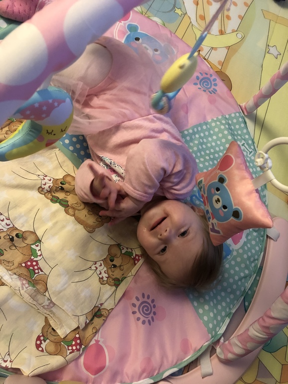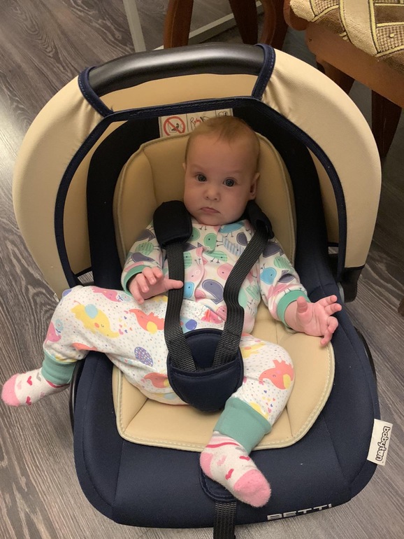 Леночка у нас более серьезная, очень внимательно рассматривает всё и всех. Очень настойчивая. Если ей что-то нужно, то это должно быть сделано прямо сейчас))) Подвинуть поближе игрушку, поменять подгузник, дать поесть) Очень смешно сидит в автокресле, вольяжно закинув ногу)))
