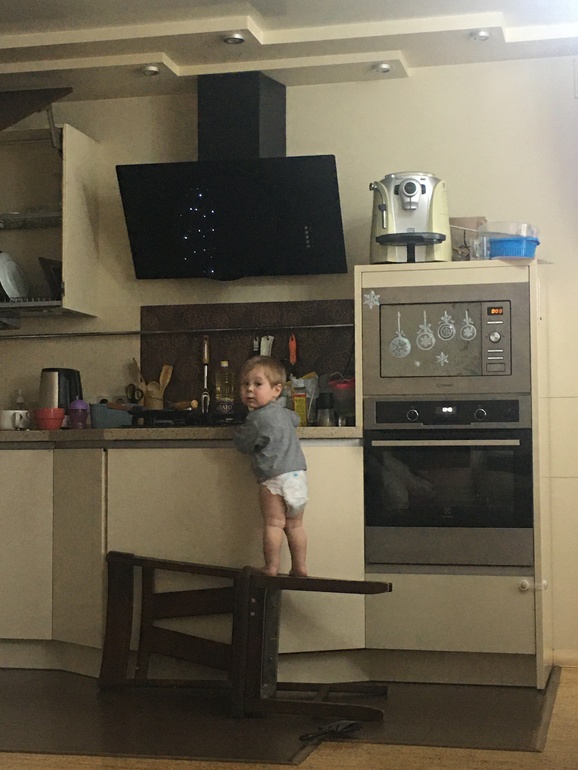 Маша в комнате подвинула табуретку, которую забыла старшая убрать на стол ( да именно на стол, тк табуретку они переворачивать умеют обратно) и залезла на письменный стол старшей. Обнаружила я ее сидящей на нем спиной к самому краю. В этот момент напротив в зале Юра залез на перевёрнутый стул ( на его ножки) и подтянувшись залез на стол. В итоге с криком я отправила старшую к нему, тк она ближе была и сама метнулась к Маше.