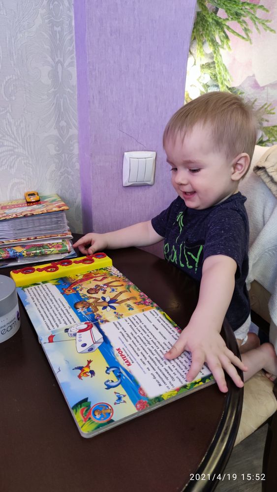 Оба стали любить книжки. Мирон оч много говорит, если без соски то почти постоянно, знает всех животных- гав-гав, мяу, ква, му-му, рычит как тигр, показывает косолапого медведя, хрюкает как свинка. Говорит мама и папа, дай, але, нет, ням ням- это прям четко. Вчера сказал "дай-дай-дай але-але" Это требовал отдать телефон и показал в окно сказал "нада гуля" (Я поняла как надо гулять). Много слов повторяет если скажешь. Говорит " Мама ам-ням-ням" Это значит мама кормит/покормила.