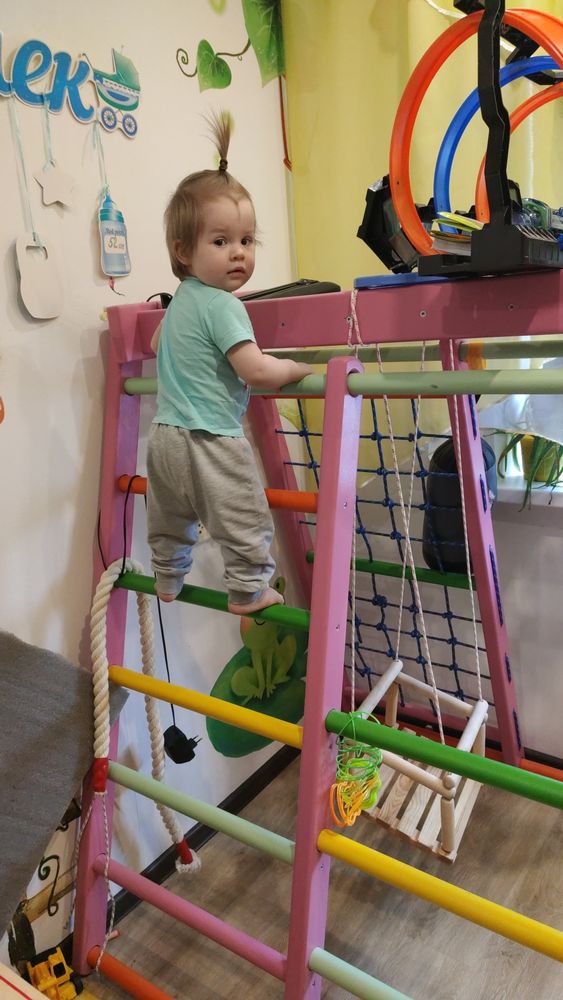 Она освоила шведскую стенку (мирон даж не пробует), висит на кольцах, стоит на руле машины, на горшке и тп. Короче Златка-акробатка- теперь так ее зовем.
