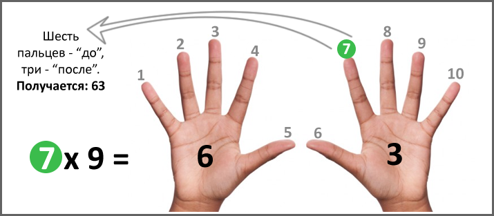 К сожалению, данным способом можно умножить только на 9. Есть еще умножение на пальчиках на 6,7 и 8. Но он немного сложнее.