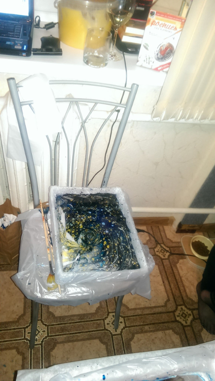 Для этого в небольшое прямоугольное корыто выливается специально приготовленный густой раствор из воды и имеющего слабые клеящие свойства нектара гевена (это растение из рода астрагалов растет только в Турции). Таким образом достигается необходимая вязкость воды. Далее в эту смесь добавляют натуральные краски, которые не растворяются в воде, а остаются на её поверхности, смешиваются между собой и образуют причудливые и неповторимые узоры. На эту смесь накладывают бумагу и через 5-10 секунд осторожно снимают и оставляют сохнуть.