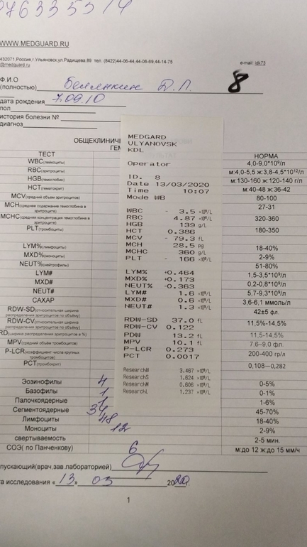 ЗдоровьеДевочки,привет. Подскажите пожалуйста прямые показания к приему антибиотиков, я прикреплю анализ крови,кто понимает в этом,гляньте пожалуйста. Сосояние на данный момкнт-5день болезни,37,2 температура,сухой кашель, заложенность носа,особенно забита одна ноздря. Нет аппетита,ребенку 9 лет....вроде бы уже и 5й день болезни,сделали анализы и рентген легких- рентген чистый, анализ крови впрде тоже спокойный ....Врач назначил противовирусное,противокашлеаое,деринат, синупрет, на ночь противогистаминное....меня смущает темпа....как думаете нужны АБ при таком лечении или нет....