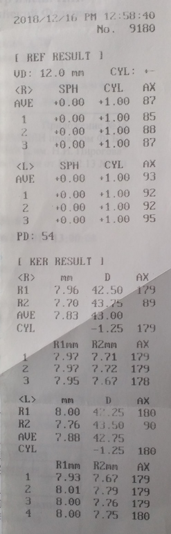 Мне всегда казалось, что раз минус, это близорукость, я уже успела "обрадовать" ребенка, что это на всю жизнь теперь очки, он успел всплакнуть. Но тут я узнала, это не всегда так, а может быть просто обратный знак и соответственно другие углы получаются. То есть при астигматизме можно на одни и те же глаза выписать как +, так и -, но с разными углами и это по факту одно и тоже. И уже глядя на верхнюю распечатку я вроде как там тоже вижу эти 180 гр. и -1,25, т.е. получается, что зрение и не упало?