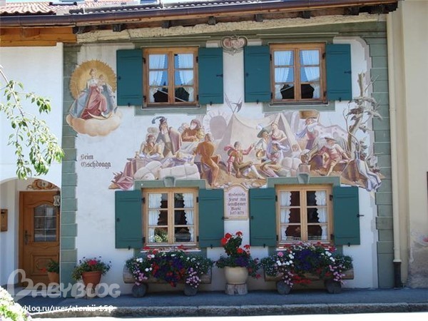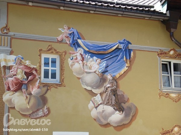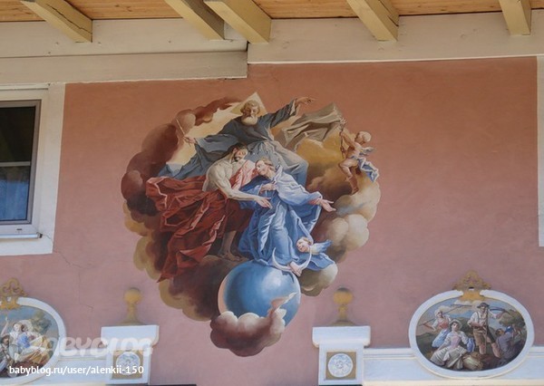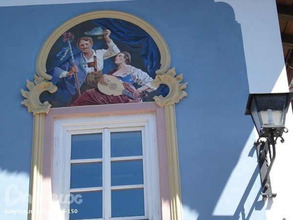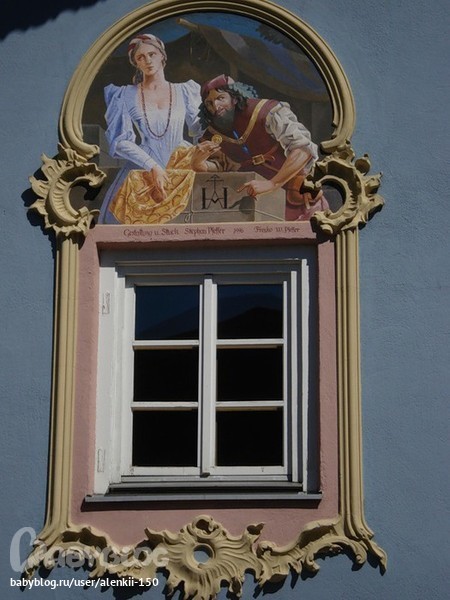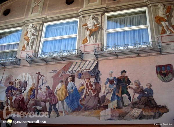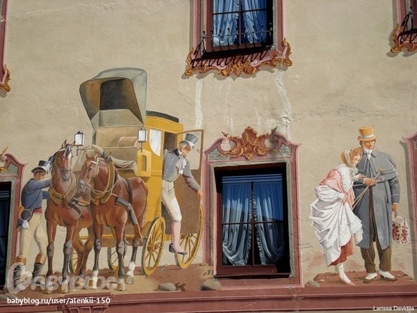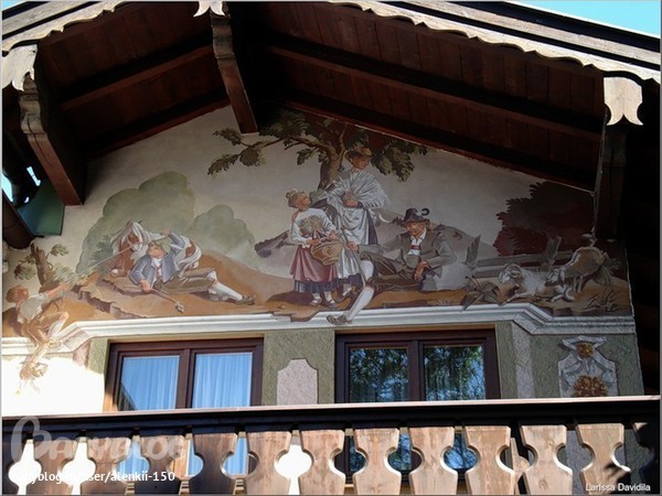 Этот городок прежде знаменит своими росписями на стенах домов, которые уже как 200 лет украшают город. Побывавший в 1786 году здесь Гёте назвал Миттенвальд ожившей книжкой с картинками. И это, действительно, так. Посмотрите, вот одна из росписей на стене. Она ему играет на мандолине, смотрит в лицо, а он кому-то машет шляпой, уж не проходящей ли по улице другой красотке?