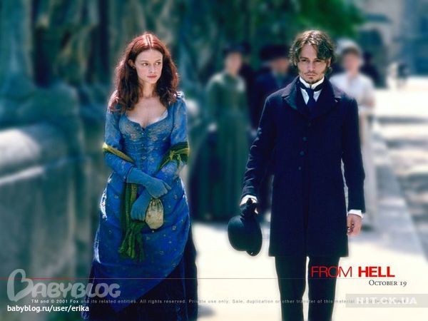 "Из ада" - Он — воплощение тьмы и ужаса. Он самый таинственный и знаменитый из всех серийных убийц, известных истории. Он погрузил Англию в атмосферу страха и породил массу слухов и домыслов. Убийца, который знает больше простого мясника или лаборанта. Убивая, он совершает чудовищный ритуал. Его прозвище — Джек-Потрошитель.Депп играет инспектора полиции(Скотланд-Ярда)