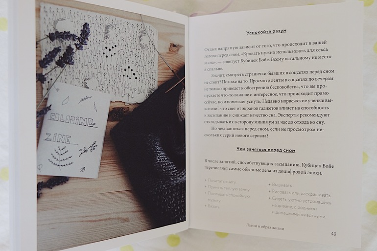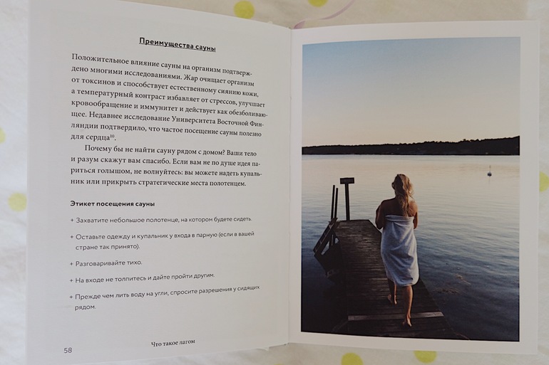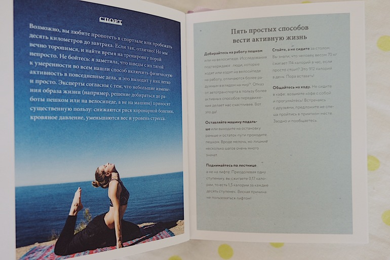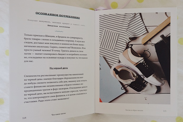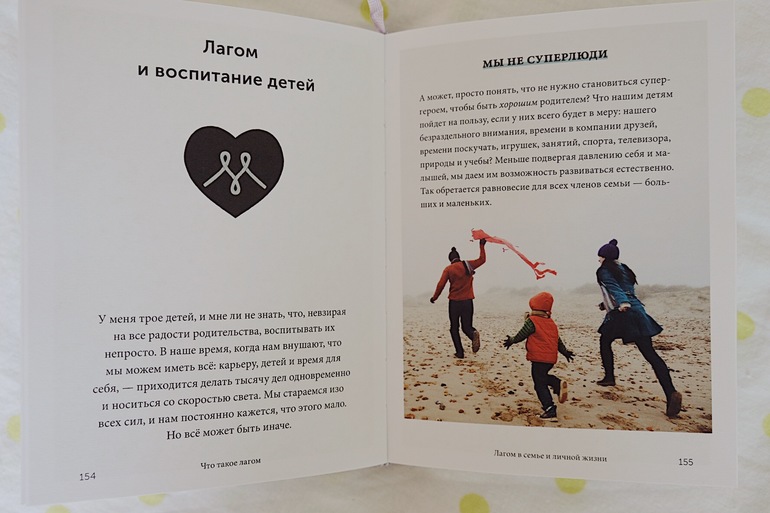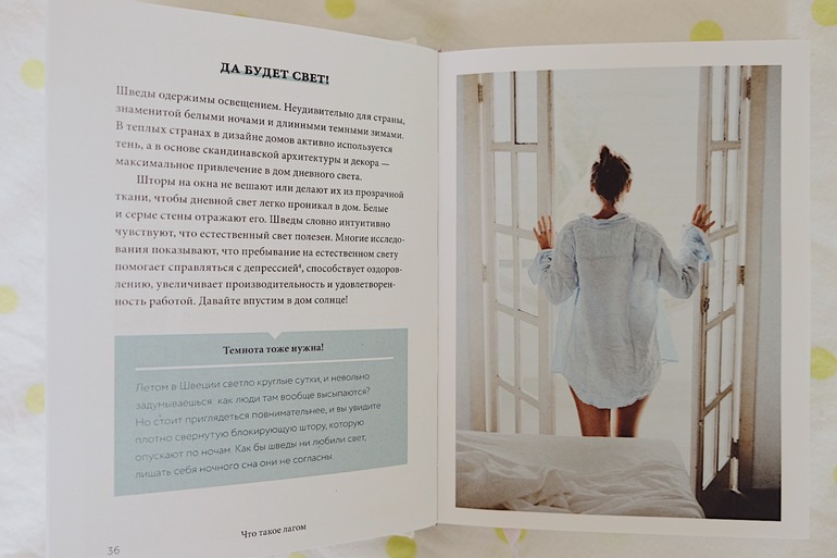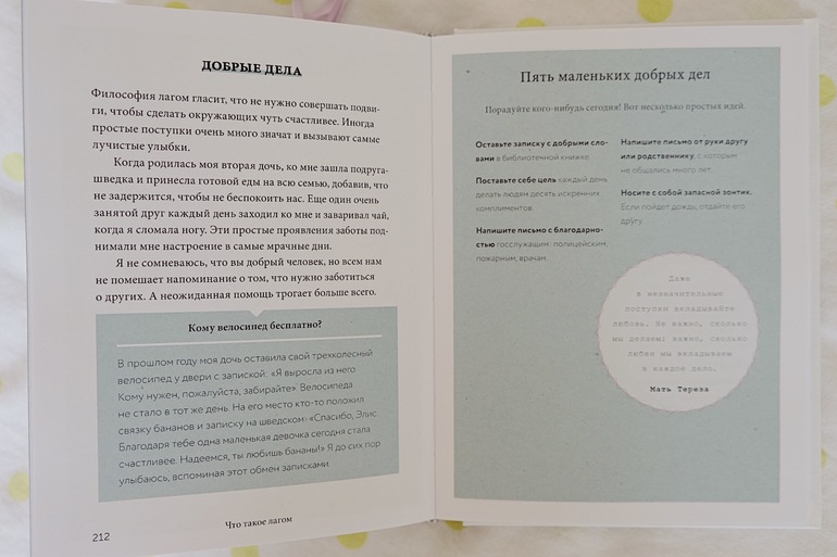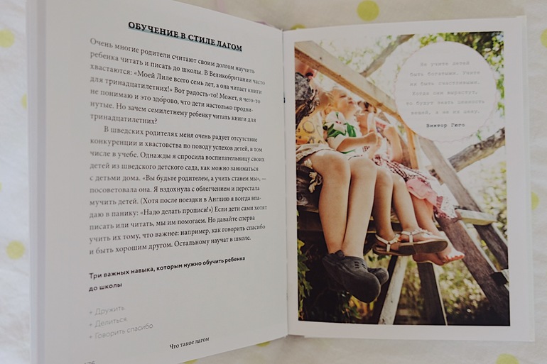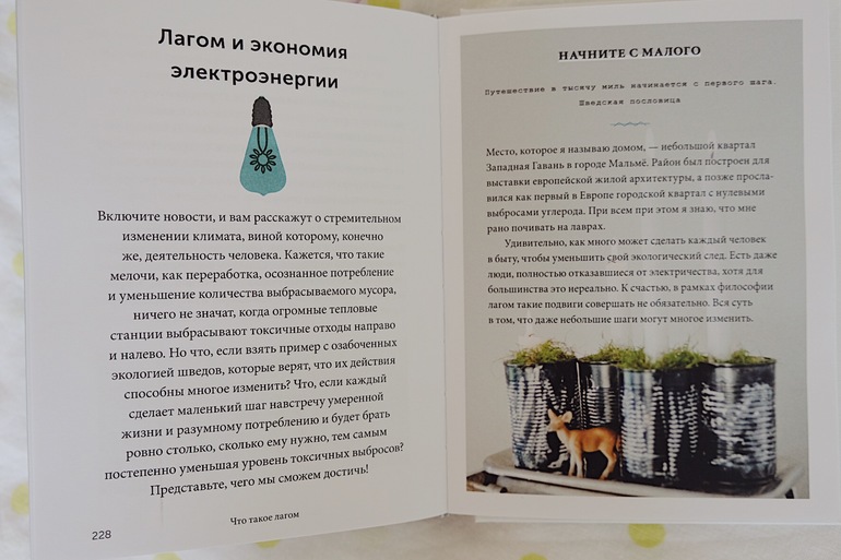 Книжка небольшого размера, приятная на ощупь, с такими милыми и вдохновляющими картинками, что выпускать ее из рук совсем не хочется. Хочется читать, рассматривать и следовать почти всем правилам жизни этих удивительных и практичных шведов! Я прочитала «Что такое лагом» за один день. Но некоторые особенно интересные моменты перечитываю до сих пор и стараюсь многие советы применить в своей жизни.