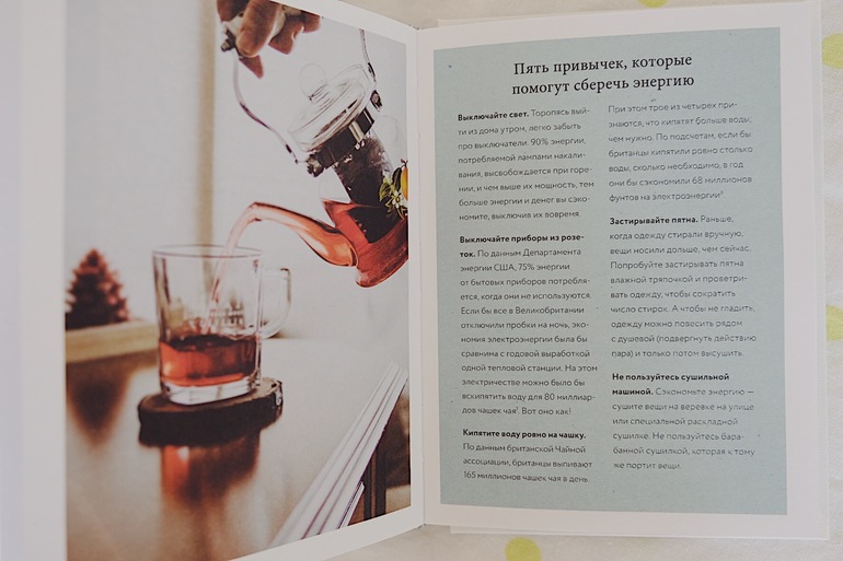 Книга читается легко и очень быстро. Все основные идеи и мысли автора дополняются приятным картинками и фотографиями. Мне кажется, если вы интересуетесь тем, как жить чуть более счастливо, здорово, экологично и качественно, эта книга даст вам много совсем не сложных, но таких очевидных и действительно полезных советов. Так что, смело рекомендую к прочтению и дальнейшему обсуждению с друзьями, а также, применению основных принципов в жизнь.