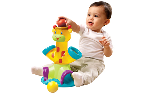 или кататься верхом на удобной машине самому, гудя клаксоном и переключая рычаг передач, точно как папа в своей машине, да еще при этом запоминать, какого цвета выскакивают с забавным звуком из-под капота шустрые шарики. Точно так поможет запомнить и распознавать геометрические фигуры и цвета самый веселый сортер «Озорной жираф». Малыш бросает шарики в отверстия и наблюдает за их движением через прозрачный животик. Когда шарики касаются дна, жираф издает 12 забавных звуков. Туловище вращается; таким образом блокируются проходы и шарики остаются внутри, что делает игру более интересной.