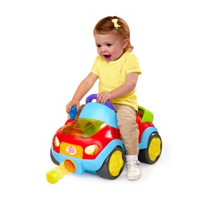 Кстати, именно машинка может послужить отличным стимулом для малышей, которые учатся ползать или потом учатся ходить! Для такого важного навыка Bright Starts придуманы специальные автомобили и самолеты, в которые ребенок должен посадить пассажира – шарик в виде животного – и нажать на нее ручкой. После чего машинка или самолет весело покатит своего водителя, а ребенок, конечно же, потянется за ними следом и ему придется проползти или пройти часть пути до остановки. Чтобы опять нажать и опять поехать. А тут уже и через всю комнату совершили вместе путь! И весело играем, и развиваемся, и растем!