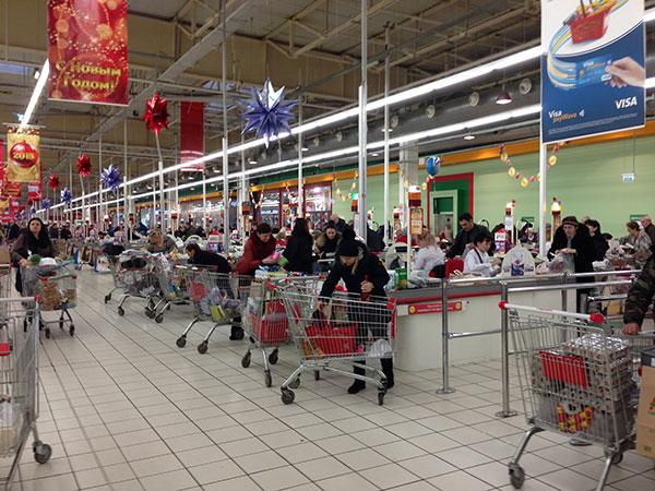 А все оказалось не так страшно. Я специально обращала внимание на то, что в тележках лежит и создалось впечатление, что народ просто затаривается к новому году. Какое-то невероятное количество пачек круп-макарон было у немногих (и, честно, у нас тоже