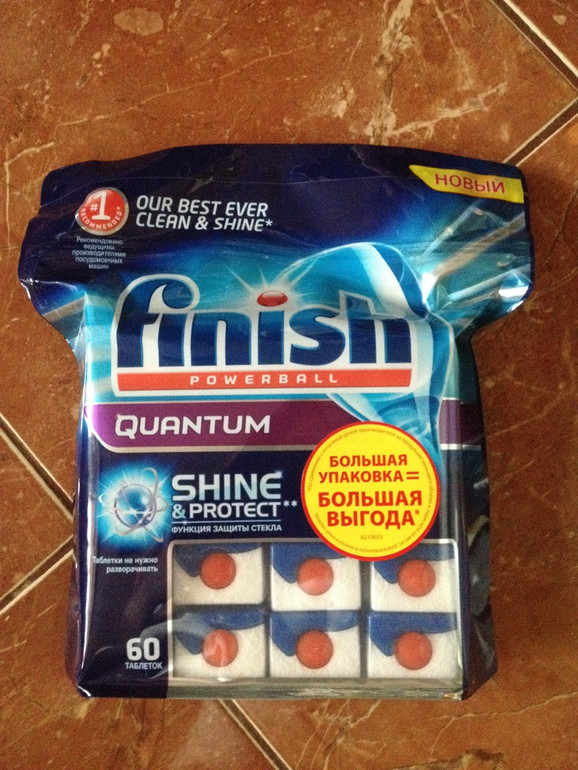 Тоже все время пользовалась Финиш квантум, пока не открыла для себя другие: Dishwasher TABS. Продаются в магазинах Лента (у кого есть, возьмите попробуйте), товар с логотипом Лента, синяя упаковка, там 30 штук в растворимой оболочке, производство Германия, стоимость 225 рублей. Абсолютно не увидела разницы, тогда зачем переплачивать.