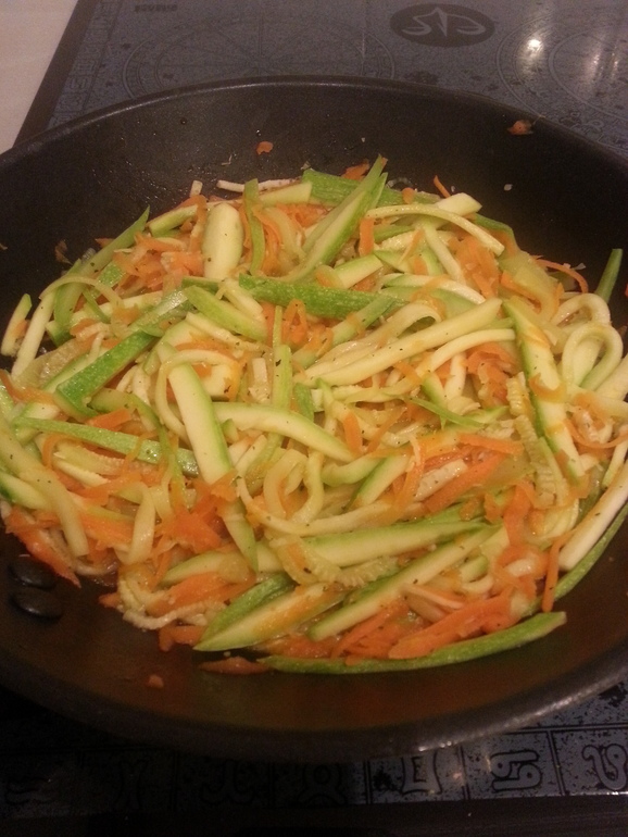 Морковь трем на терке, кабачок порезала тонкой соломкой + тертый чеснок. На сковороду каплю масла и тушить на не большом огне до готовности . Все готово. На двоих получидось около пятидесяти рублей.