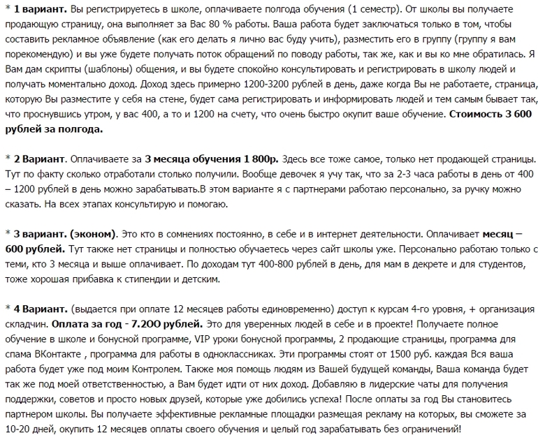 "Большинство людей работают через партнерскую программу, что я вам и хочу предложить и обучу при желании. Это когда вы просто подключаете людей в школу (не важно знакомые будут это или просто люди с контакта). Важно то, что за каждого зарегистрированного по вашему персональному номеру, который выдаст школа, вам начисляется на кошелек от 400 до 4800 рублей, которые ты сразу можно вывести на карту или куда удобно. Весь необходимый материал даю. Добавляю в наш коллективный чат, помогаем 24/7. Люди сами пишут и спрашивают, искать никого не надо, просто делать все по инструкции, плану, который Я даю! Но вы можете просто оплатить Бизнес - курсы и учиться по ним"