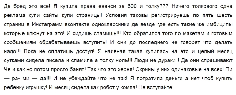 Лично я думаю, что многие люди по доброте душевной вложились, и искренне верят, что помогают компании продвигать на рынке их бизнес-курсы. Такие люди называются наивные. Но я также просто не сомневаюсь, что есть мадамы, прекрасно осознающие что и зачем они делают. Они знают, что ничего не продают, а тупо имеют доход с других наивных граждан, наживаются на их доверии и продолжают ежедневно всё с бОльшим усердием строчить посты о легком заработке и комментарии о заработанных деньгах и об отличном и дружном коллективе. Такие люди называются суки. Из серии "меня засосало в болото, потащу другого".