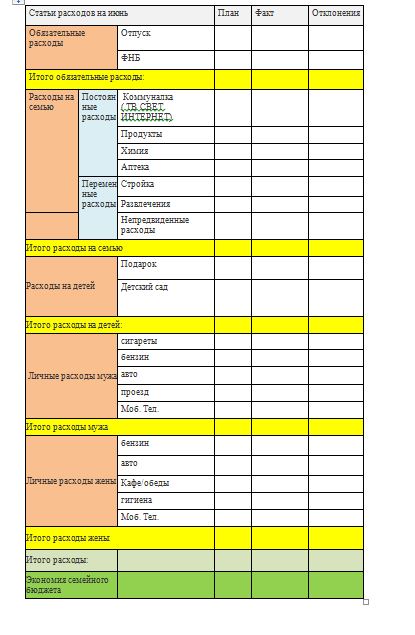 - Расписать все ваши расходы по важности, способ оплаты ( Н- наличка; Э -по карте) и по сроку наступления обязательного платежа на июнь (если знаете примерные суммы трат по обязательным платежам, то указываете, если нет, то не надо)
