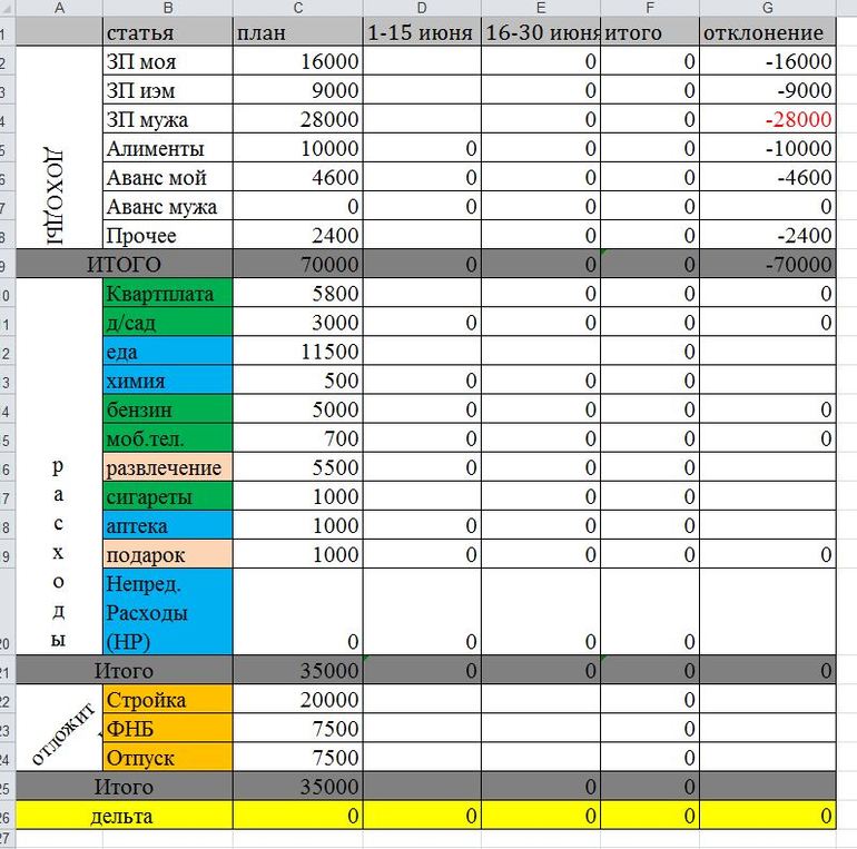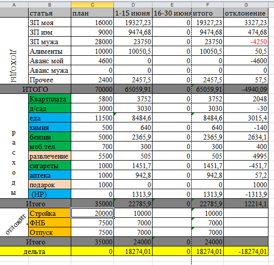 Номер 26. С таблицей у меня по-прежнему туго. Итого за 15 дней, з/ та мужа на 2 т. р меньше(отклонение), квартплата вместо запланированных 12 потратила 12550, еда-8282+300(пиво)...в 10т.р уложилась. Химия (гигиена) 773р.42 к., бензин плюс для машины..планировала 3000р.., истратила 3001 р. Подарки 150 (на цветы учителю в день рождения). Аптека и лечение (вместо 2000 р) истратила 4381...перерасход больше, чем в 2 раза.. Незапланированные траты..коса для травы плюс бензин (6300), обувь мужу 3 пары (4630).... Кредит в этом месяце погасили, коммуналку оплатили,Ю На стройку и будущий балкон отложили 10тр. На детей потратила 3200.. Вклад закрыли, страховку на машину оформили...вышло то, на то.Даже в небольшой прибыли остались. Дочери на дорогу 4000 р отдала.. Перерасход по непредвиденным тратам большой(10тр) , по тратам на детей и по лечению. Надеюсь в следующие 2 недели этого не будет...