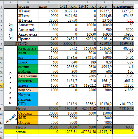 . Но доход превысил запланированный и поэтому отложить поучилось побольше. В минус не ушли но только потому что не было ремонта машины, не купили ребенку путевку в лагерь. Если бы и эти траты были бы конечно в минусе.