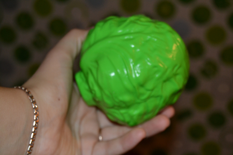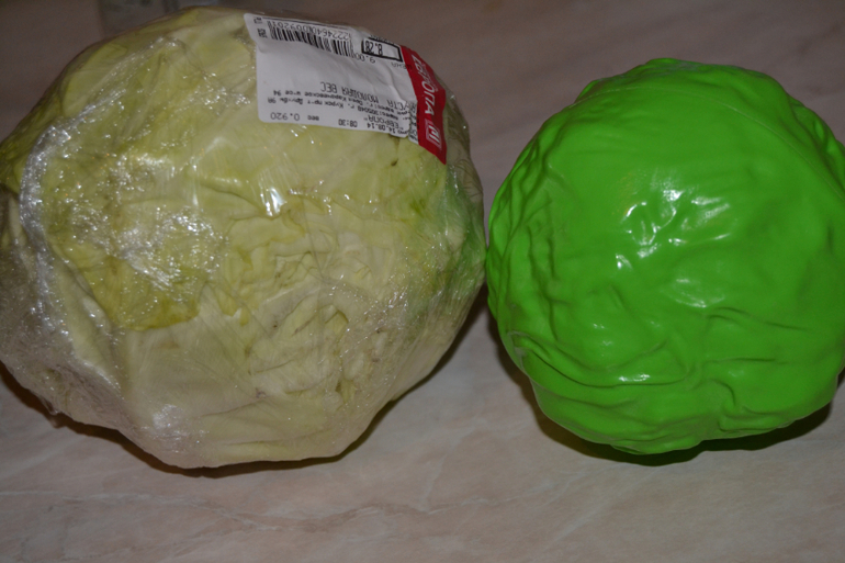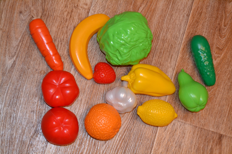 Реалистичные муляжи (и по цвету и по размеру), крепкая пластмасса, нет запаха. 13шт: капуста, помидор, кукуруза, морковь, огурец, перец, чеснок, яблоко, груша, банан, клубника, лимон, апельсин