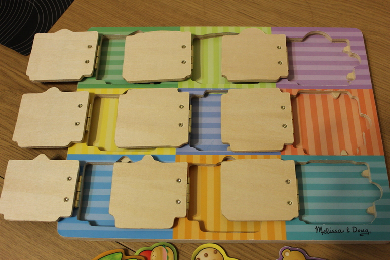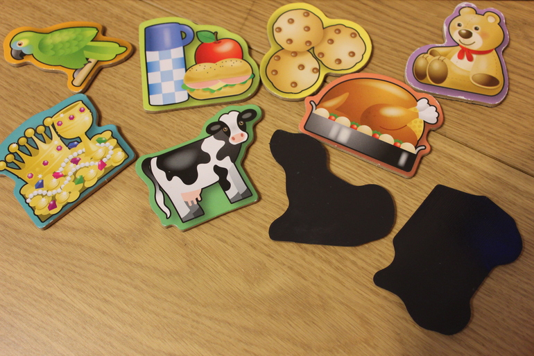 Дощечка и дверцы выполнены из дерева. Верхний слой - гладкая бумажная наклейка (возможности ее оторвать нет!). Предметы тоже деревянные, с одной стороны - магнит, с другой такая же бумажная поверхность, как и на самой доске. С оборотной стороны игрушки приклеены правила безопасности на нескольких языках. Дощечка имеет 9 дверей - амбар, где живет корова, ланч бокс с завтраком (яблоко, термос и гамбургер), коробка с подарком - внутри мишка, коробка с печеньем - три овсяные печешки внутри, гараж с машиной, кухонная плита с курочкой на сковородке, собачья будка с псом, клетка с попугаем и сундук с сокровищами! Каждый элемент игры имеет свой цвет, который повторяется на спрятанном предмете. Магнитики удобно крепить на холодильник и еще мы используем их при изучении животных!![]()