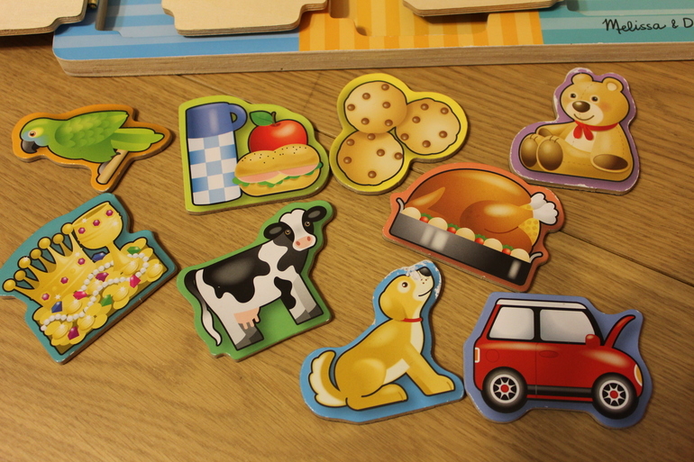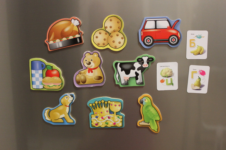 Суть игры основана на том, чтобы мама прятала, а ребенок искал предмет, но пока, в силу возраста мы так не играем. Зато клеим предметы на холодильник и всегда очень рады доске! После игры, я прячу ее в ящик с игрушками, чтобы малыш немного про нее забыл.