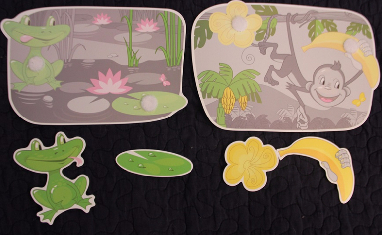 Внутри коробочки 6 игровых полей, к каждой из которых крепятся по две картинки-липучки. Задача малыша состоит правильно приклеить карточки по цветам.