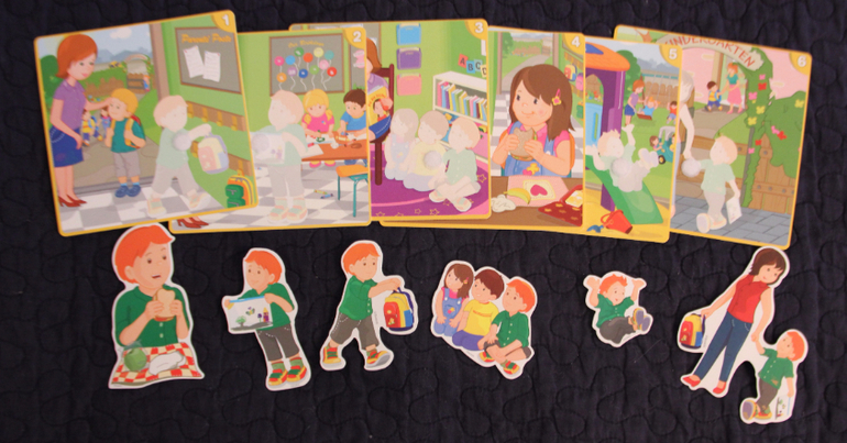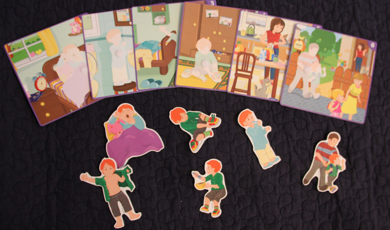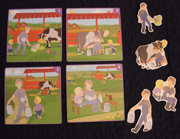 Как уже сказала в наборе еще 4 двухсторонние карточки. Ребенку, глядя на карточку предлагается выстроить такую же логическую цепочку. Ну это задания для более продвинутых деток с 3 лет наверное.