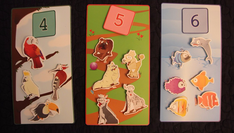 В комплекте 6 игровых полей, 21 фигурка изображений животных, 6 карточек с числами от 1 до 6.