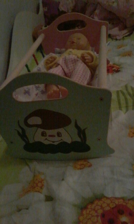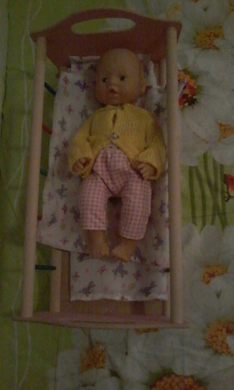 А вторая моделька попроще, но по качеству не уступает. Она знакома многим) Качалка из дерева. Тоже вполне качественная, красивая, милая, собирается легко. Постельное белье совсем хилое, но оно есть. Длина 50 см. Её цена 397 руб. Мне нравятся обе!!!