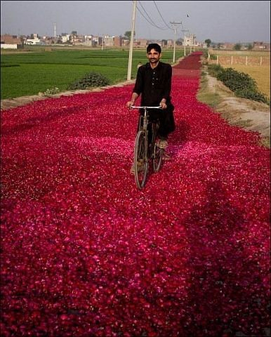 Фотография сделана на окраине Пакистанского города Лахор. Вся улица усыпана лепестками роз. Таким образом оптовые торговцы высушивают их перед поставкой на рынок.