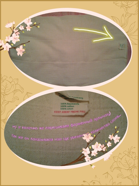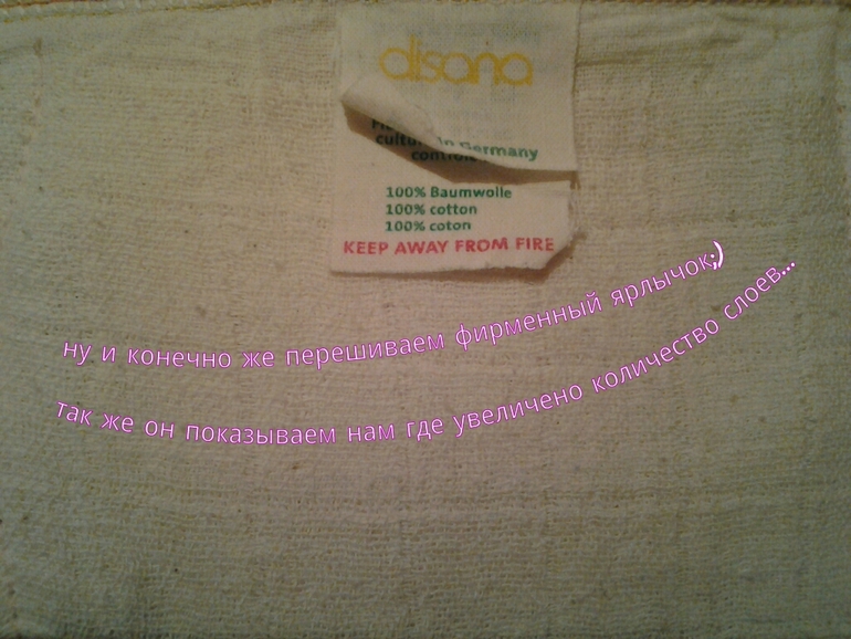 Ай да молодчина! Здорово придумано!!!И меня эти края неразглаживающиеся подбешивают)))) если сушить на веревке их еще можно худо-бедно разгладить пальцами, а если из сушилки достаешь, так вообще ужас. Едиственный минус сушилки для меня)))Кстати если края подвернуты и прострочены, как на американских пеленках или муслине имсе, такой проблемы нет!А второй муслин у тебя скорее всего Пополини! Но могу ошибаться! Вообще бирка на их похожа! Шрифт текста
