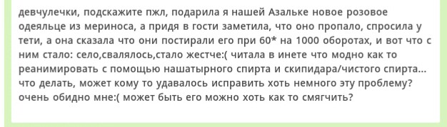 Искала искала щас этот пост, не нашла (( вроде-бы девушка писала что мама ее кофту замочила в хоз мыле, кофта была сильно севшая и в пятнах. Пятна отошли и мягенькая пушистая стала.