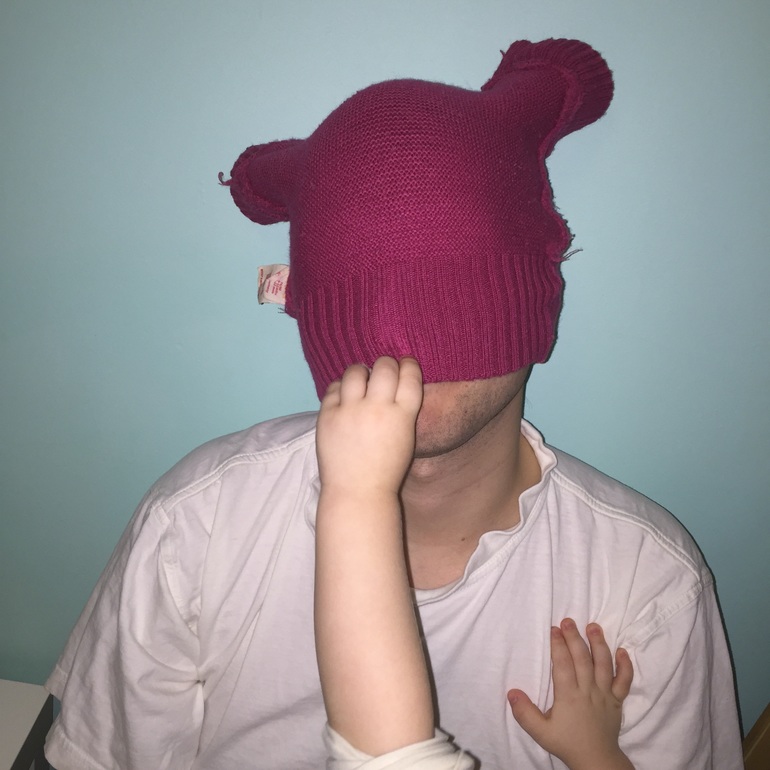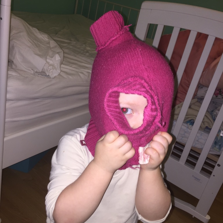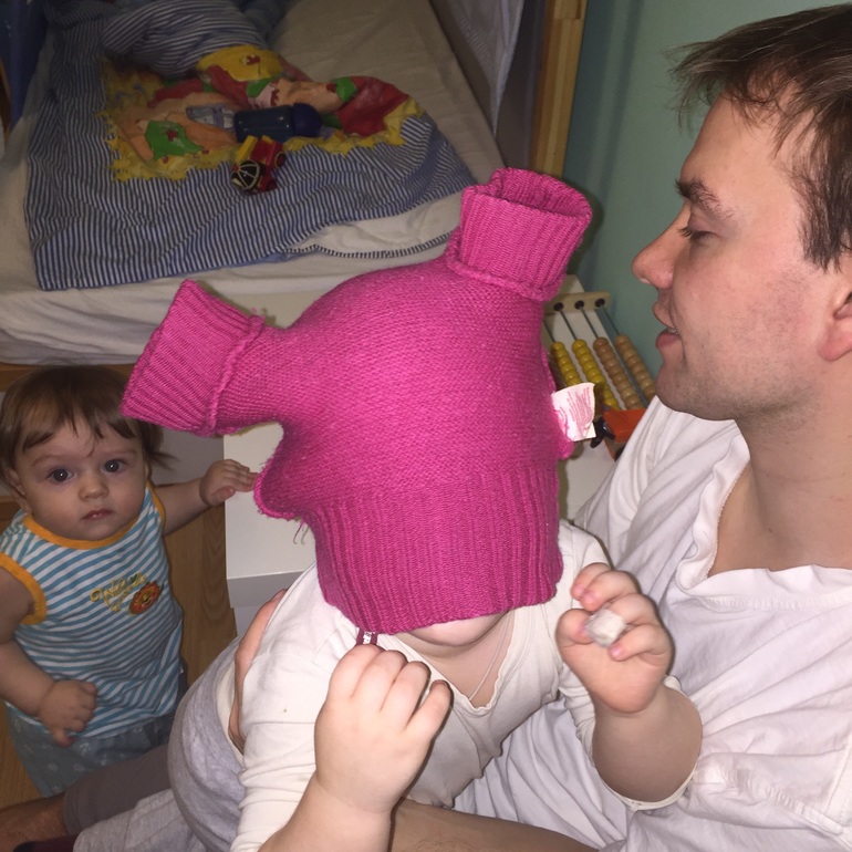 Позитивная фотка)Нашему тоже должна налезть такая дисана-можно в жмурки так играть. Мои девочки тоже обожают когда папа дома и с ним можно подурачиться и полетать к потолку(мне под силу только Васёну по подкидывать).