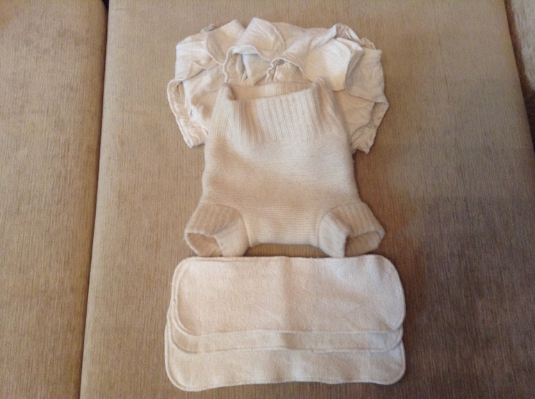 Три пары шерстяных штанишек (красные, синие и бежевые - все 62/68) и 2 вкладыша из буфетного шелка))))