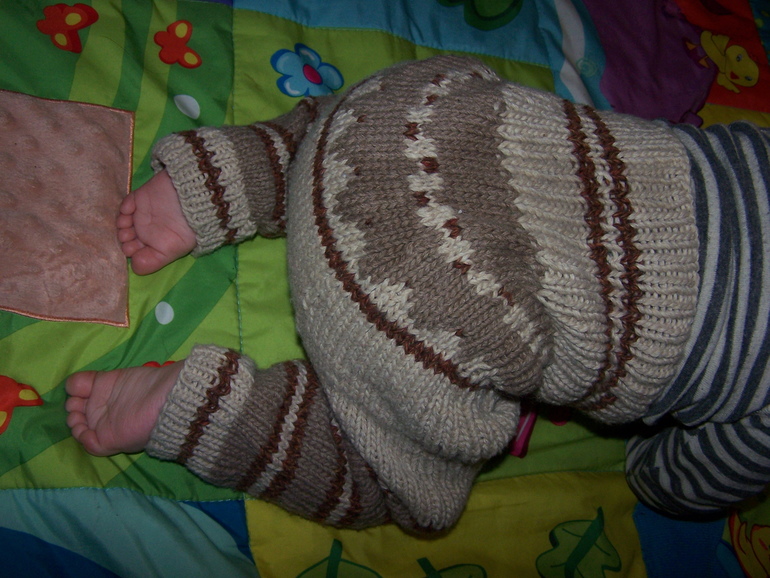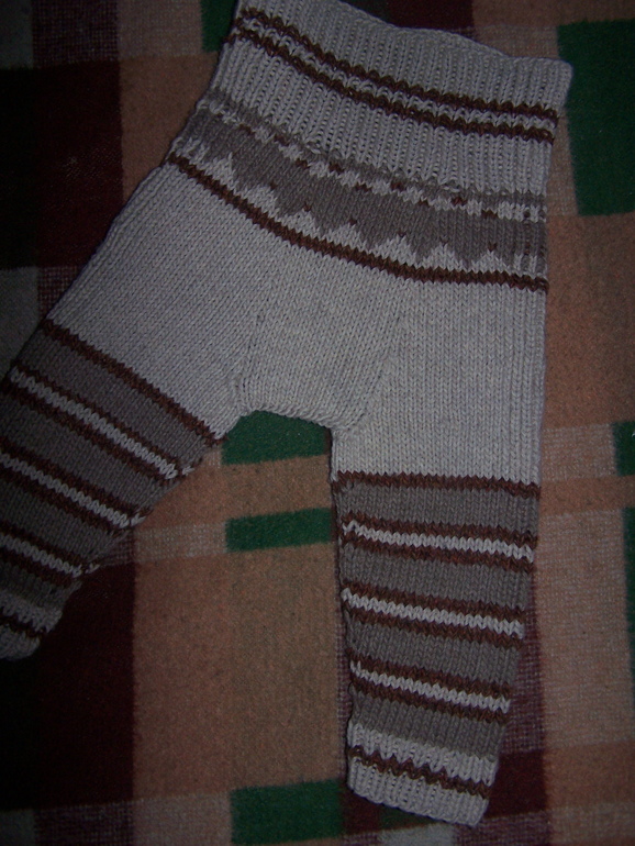 Смесь мериноса с верблюдом... То, что надо! И... хотела связать штанишки а-ля Бэбиидея. Не судите строго, "косяков" много напорола, но и многому в процессе научилась. Штанишки получились Мишутке на вырост (и опять Богдану они понравились, детям наплевать на кривые швы). В поясе сделала дырочки, чтоб можно было еще и шнурочек вставить. Но пока они и так держатся, не теряются, ни на Богдане, ни на Мишутке. И супер-теплые, мне самой теперь хочется что-то из верблюжьей шерсти, только мягкой.