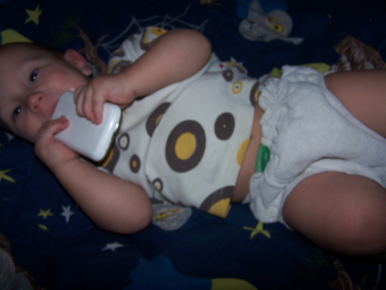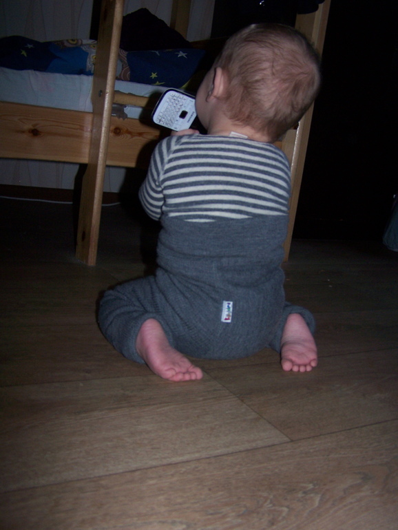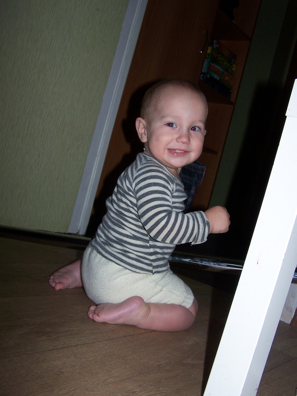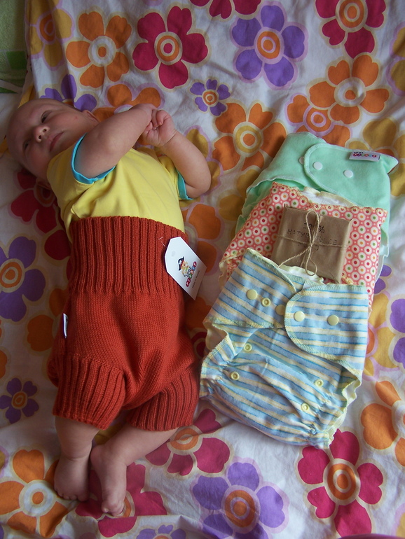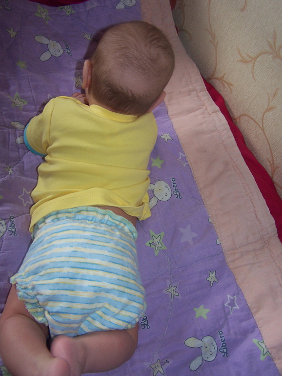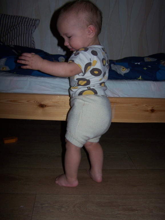 И коленям холодно. Обычно надеваю сверху Наппи алладинчики от Вали, но сегодня вспомнила, что можно бы уже постирать Бэбиидею, ну и пусть поносит перед стиркой