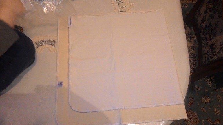 7. Муслиновый вкладыш. 80 на 80 см. Края обработаны плотным оверлоком, нитью молочного цвета. Ткань некрашенная. 3 шт. На фото мой испытуемый (сверху который) и новый: