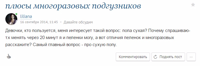 "самый главный вопрос", почему я решила, что он самый главный? Потому что пока не попробовал, кажется что комфорт заключается ТОЛЬКО в сухости (реклама, наверное.. "сухо и комфортно"). Пока не попробовал, никто не подумает, что комфорт не только в этом (или СОВСЕМ не в этом). Не трут липучки - хлопок мягко обнимает, не холодит гель попу- мериносик поддерживает температуру, кожа дышит... А то, что она дышит, это совершенно точно, я про натур подгузники, и то что она "не кайфует" в одноразовом я тоже скажу. и каждая женщина скажет - ну вы поняли... а если эта женщина ещё и МПр попробовала - точно скажет