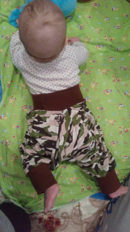 С переходом на МП возник вопрос по поводу одежды,решили что просторные штанишки самое то для пчелопопы.Хотели пошить пару штучек на пробу,но не смогли остановится-расцветок море,а для ребенка просто супер-свобода движений! Папина любимая расцветка -камуфляж..