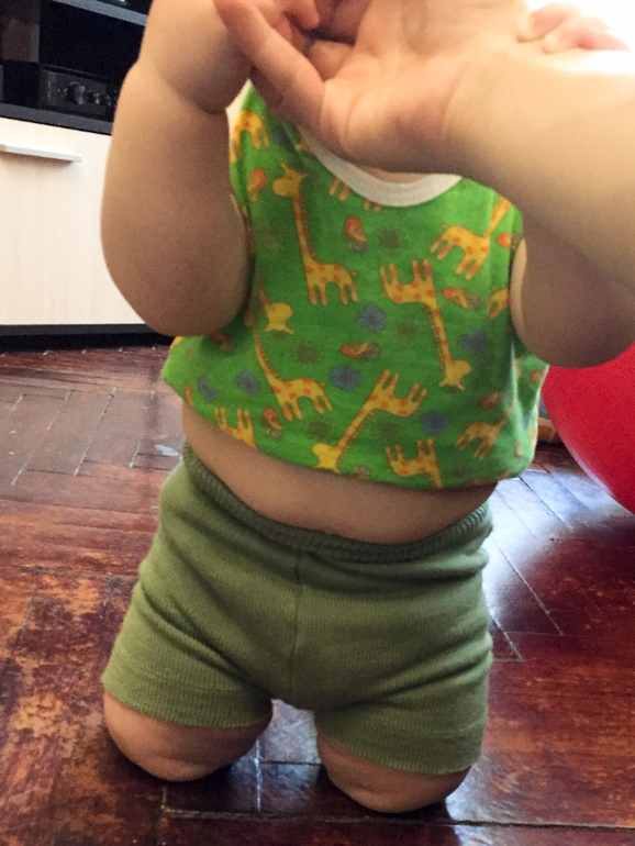 Тут я подняла маечку показать, что запас в высоту есть. Мне не хватило запаса в ширину, чтобы покрыть подгузник, или просто кто-то слишком много ест (С)