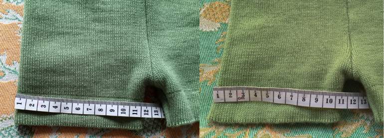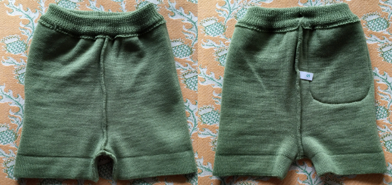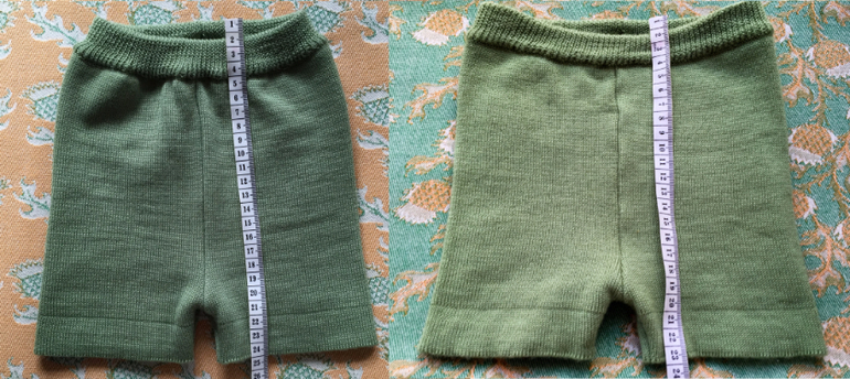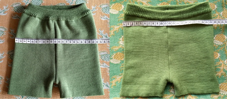 Итак, шортики из двухслойного, но в тоже время тонкого полотна на фото снаружи и с изнанки, а также с замерами до и после ручной стирки и обработки ланолиновым уходом.