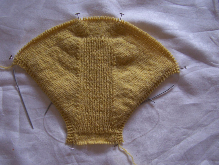 Вязание по кругу: Удалить вспомогательную нить и перенести петли на спицы. При необходимости вы можете использовать ещё одни круговые спицы (я брала ещё одни, с более короткой леской, чтобы упростить процесс). Соедините перед и зад напопника, провязывая петли по кругу (убедитесь, что промежность не перекручена). Вяжите 18 [20, 21, 22, 23, 25] кругов.