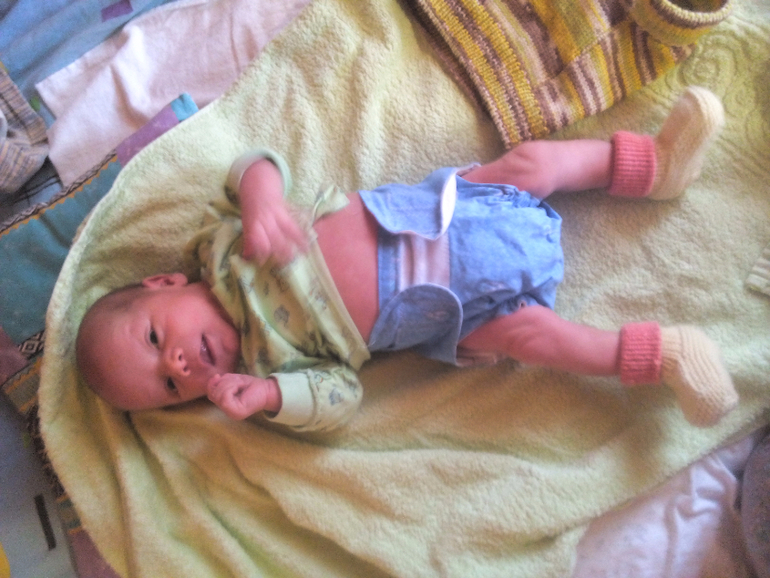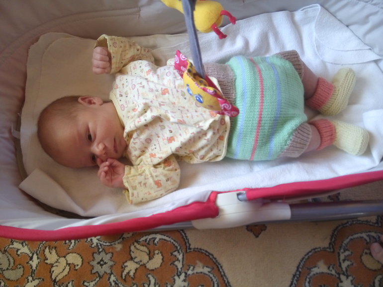 Ну и покажу вам немного своего мальчика в самовязах. Простите за качество фото, камера в телефоне не очень, да ещё и модель подвижная. Здесь Аркадию около месяца и около 5 килограмм. Тогда мы ещё боди не носили, так что под штанами - тканевый подгузник: