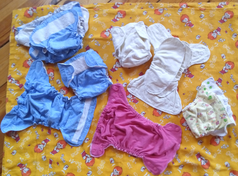 А это подгузники, которые я шила. Всё переживала, что не хватит, хотя у меня в заначке от старшего было ещё 6 штук дисановских итальянских пелёнок. В итоге муж и мама совершенно не прониклись к кнопкам, им куда больше понравились подгузники на липучках. Я сначала честно справлялась с кнопками, а потом мы все отказались вообще от всех подгузников. Сейчас у нас системя а-ля тренировочные шторхи, только без кнопок. Между ног вкладываем префолды, сверху натягиваем напопник, кнопками бодика закрепляем конструкцию, чтобы штаны не сползали.