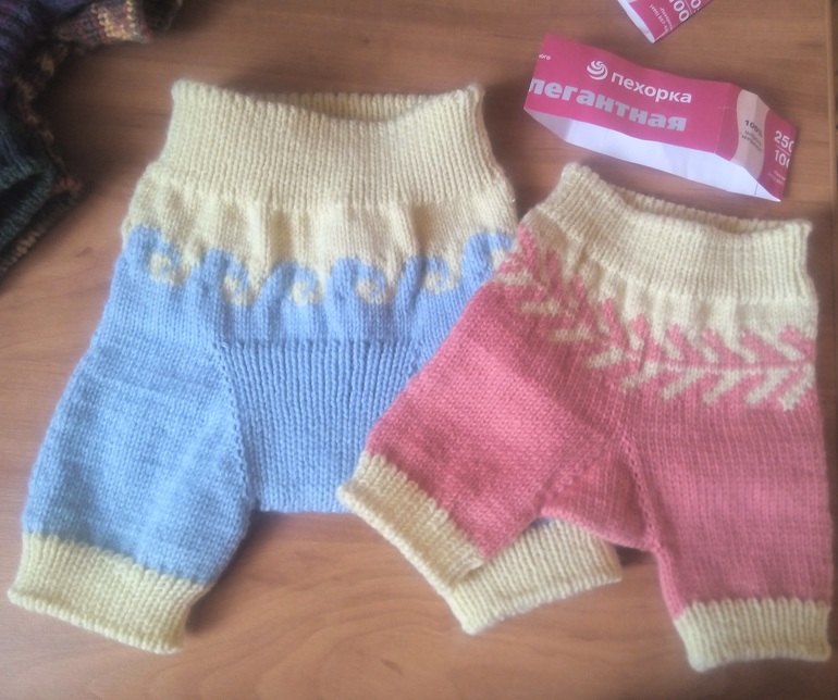 Голубые штанишки связаны по тому же описанию, что выше (только резинка между ножек не 2х2, а 1х1).