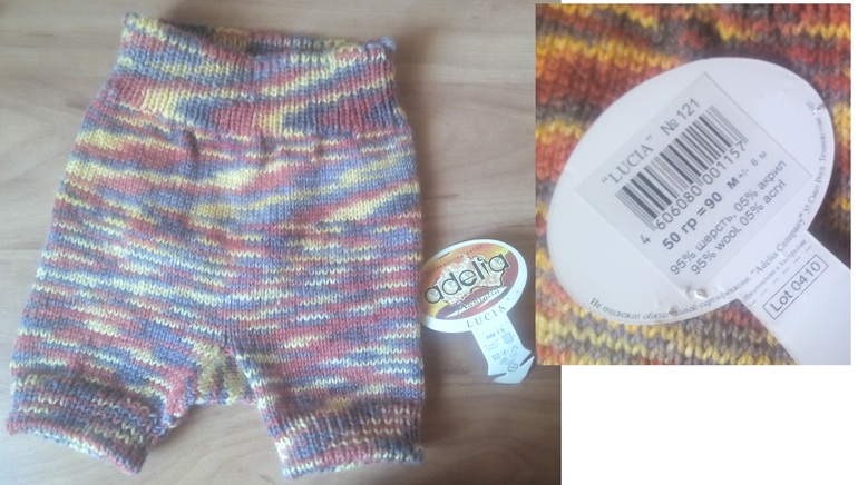 Оранжевые я вязала так: сначала по кругу резинкой, потом лицевой гладью. Связав гладью две трети длины штанишек (длина без учёта резинки), я вязала половину петель укороченными рядами (чтобы зад был выше переда и лучше облегал попу), потом продолжила вязать по кругу. Определила центр переда и спинки, справа и слева от центральных петель прибавляла по одной петле в каждом втором ряду. Собственно, такие прибавления можно делать сколько угодно (до желаемой ширины промежности штанишек). После этого трикотажным швом закрыла треугольники, а штанины вязала по очереди по кругу.
