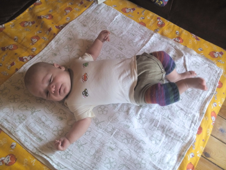 А здесь уже в боди, три месяца, около 7 килограмм (а штаны всё те же!) :)