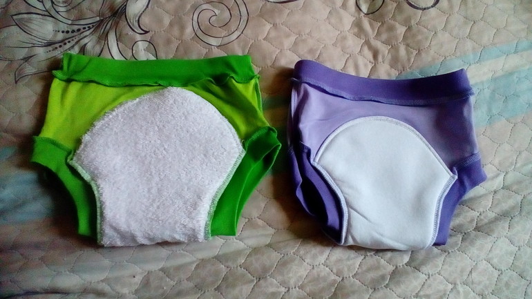 А с непромокаемым слоем тоньше, потому что при более тонком вкладыше жидкости не даст вытечь непромокаемый слой. Если сделать промокаемые трусики с тонким вкладышем, то они совсем держать не будут. Если промокаемые хорошо впитывают, то попробуйте одеть сверху шерстяные штанишки для защиты.